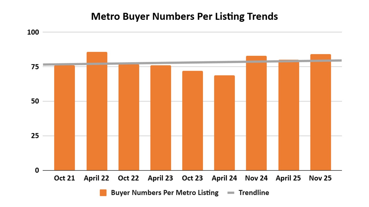 Finding 2: Average buyer numbers per metro listing have remained consistently high around 75 - 80.