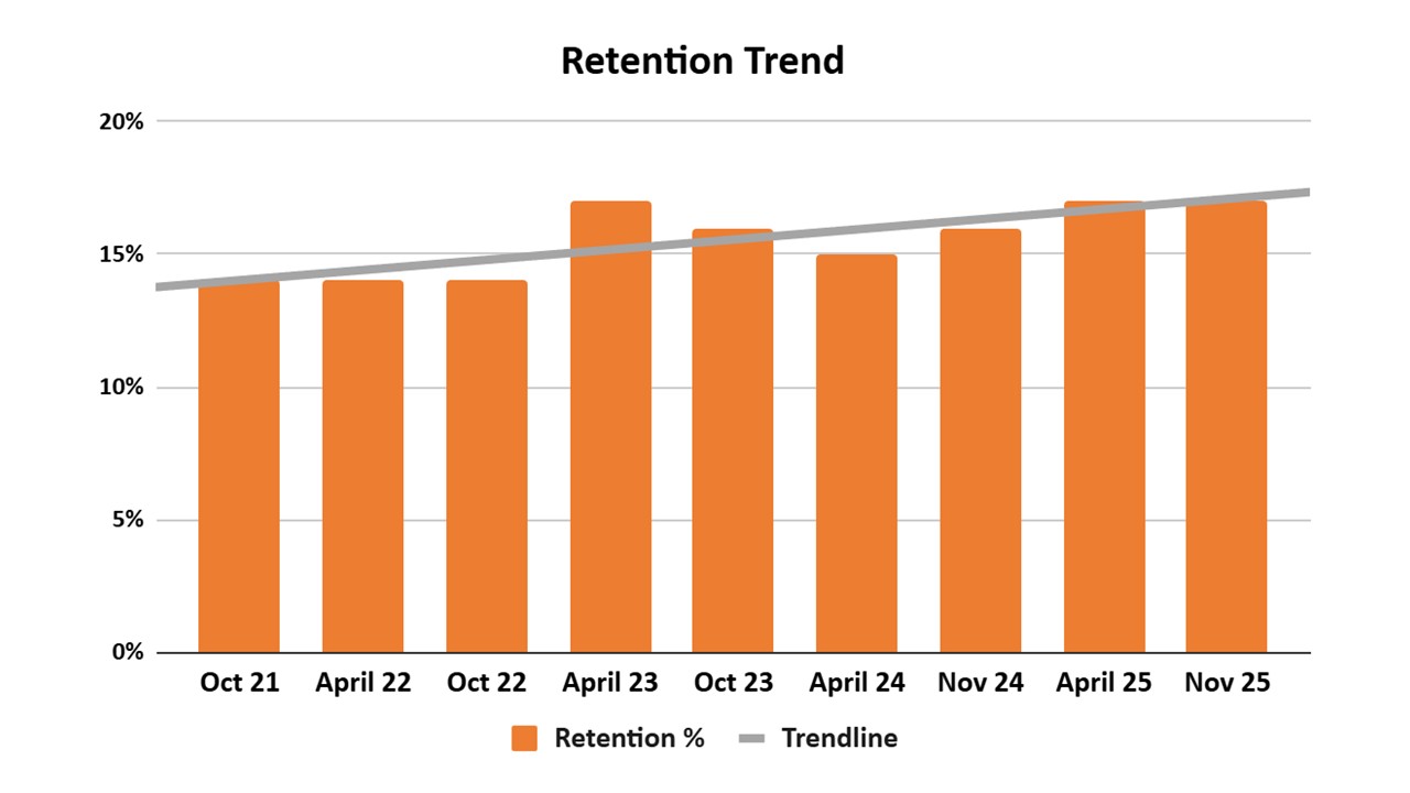 Finding 3: There has been an incremental increase in average retention since 2021 - from 14% to 17%.